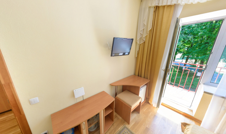 В номере: мини-холодильник, одна полуторная кровать, стол, стул, телевизор, тумбочка, электрочайник, набор посуды, зеркало, вешалка