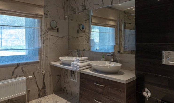 В номере: кухня, вешалка, диван, зеркало, кровать двуспальная, прикроватные тумбочки, стол, стулья, шкаф, гладильная доска, камин, кондиционер, микроволновая печь, набор посуды, посудомоечная машина, стиральная машина, утюг, холодильник, чайный набор посуды, электрическая плита, электрочайник