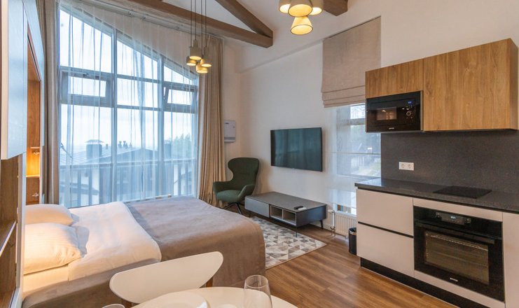 В номере: кухня, вешалка, диван, зеркало, кровать двуспальная, стол, стулья, шкаф, гладильная доска, кондиционер, микроволновая печь, набор посуды, посудомоечная машина, стиральная машина, телевизор, утюг, холодильник, чайный набор посуды, электрическая плита, электрочайник
